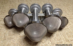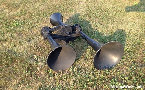 Westinghouse E-2B-1 An early multi-chime Westinghouse horn, the E-2B-1 is actually three separate single note horns mounted on a special manifold. Never catching on, the E-2B-1 is fairly rare these days and you're extremely unlikely to find one in service other than a museum piece. Early versions of this horn, like this one shown here, used an E-2 with two B-6 horns while the remainder use the newer B-7s in place of the B-6s. Made of mostly cast iron with some aluminum, this E-2B-1 weighs 74 lbs. |