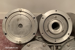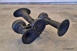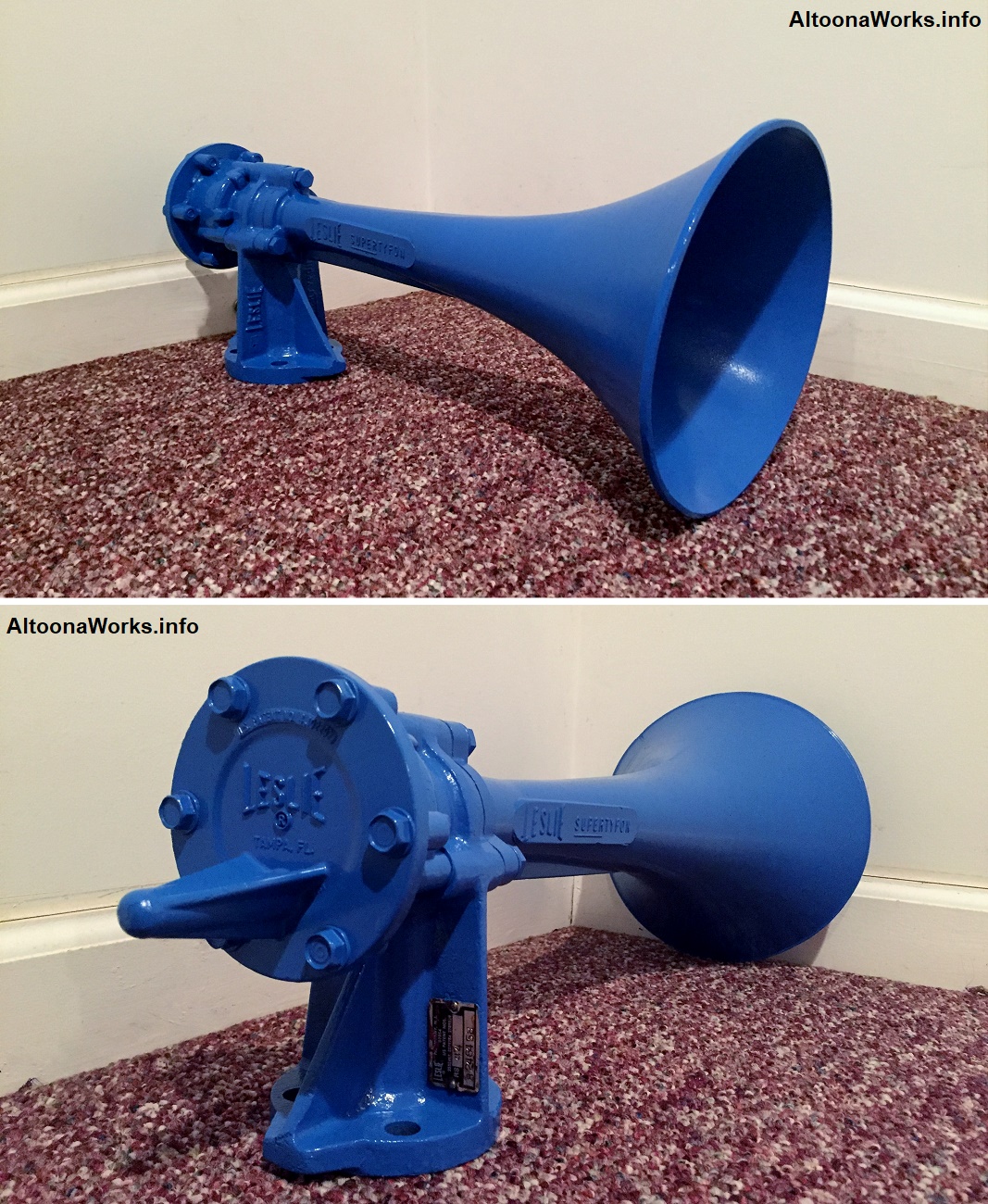 Leslie A-200-LP This all-bronze A-200 likely dates to the 1940s. A-200-LP is the pre-1950 designation for the A-200-156. I got this horn, not so much because they were used on the PRR GG1 (this one likely was not), but more for its rich, low pitch sound. This horn weighs 50 lbs. You're not likely to see an A-200 in use today except on a museum piece. |