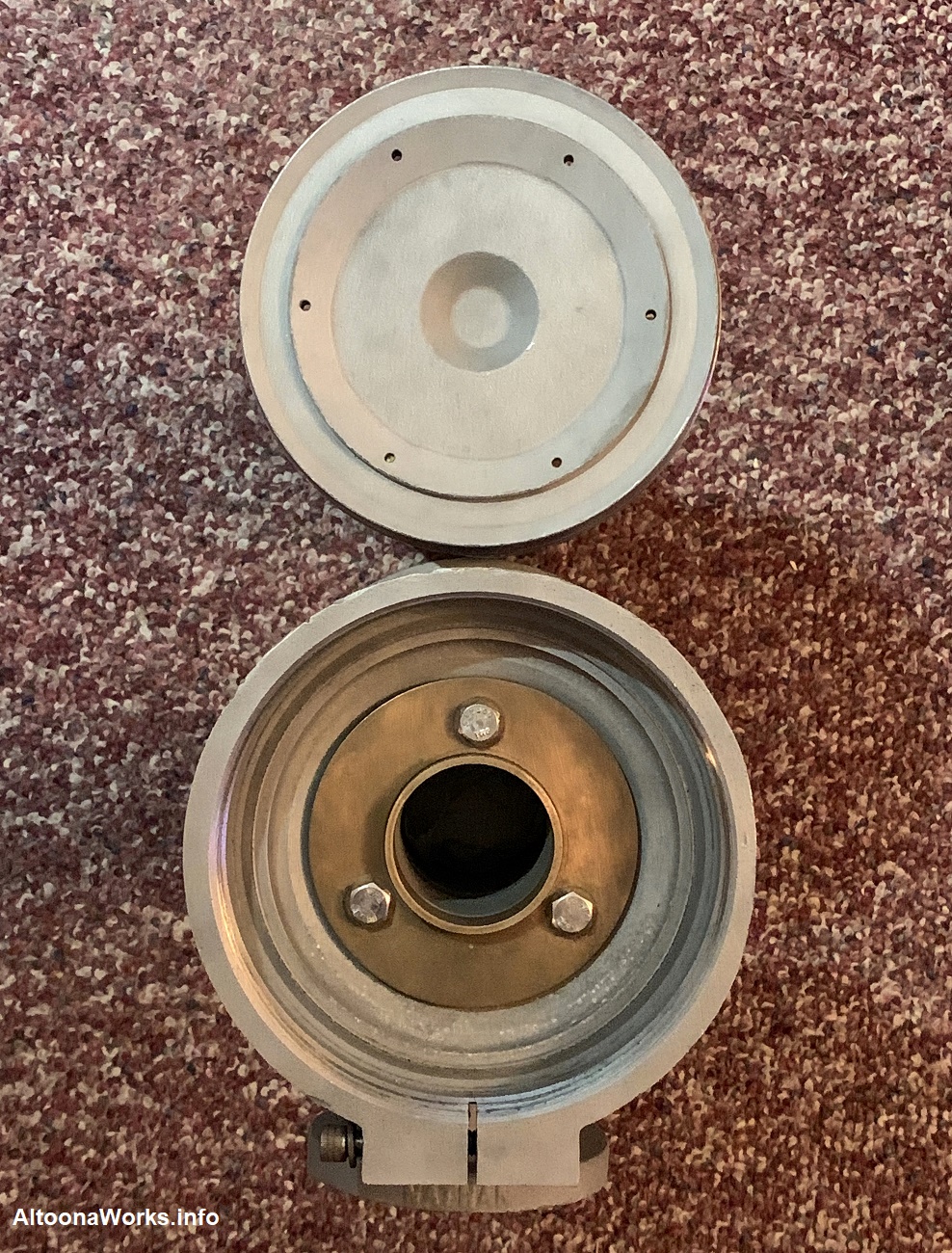 Nathan/AirChime M5 The M5 is probably the most sought-after horns among collectors for its melodic tone. The Southern was a big user of the M5 and the Rockhill Trolley Museum's Mack gas-electric also had one for a time. The M series was replaced by the easier-to-maintain K series and you're unlikely to find them in use on anything but museum equipment. This particular M5 dates to the 70s and was previously on an Amtrak unit according to the previous owner. The M series fell out of favor with the railroads because they're labor intensive. They have to be voiced and in order to reverse bells, one basically has to disassemble the entire horn. |