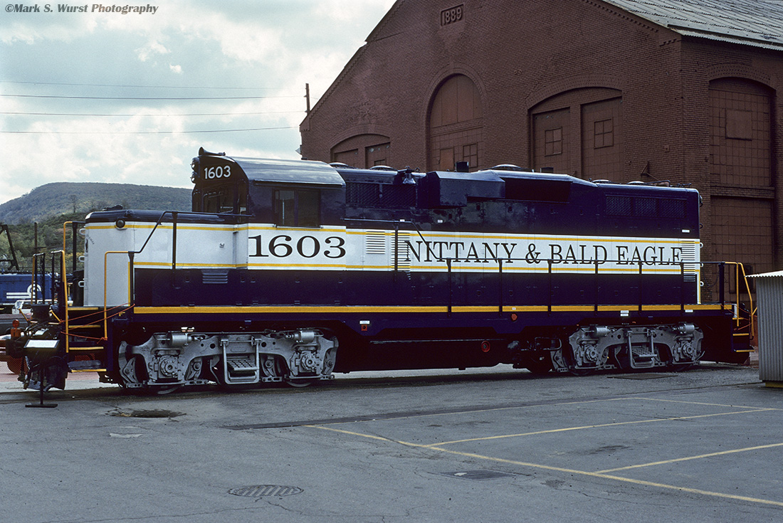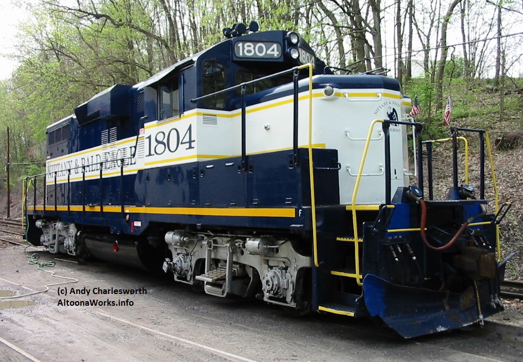 Paint Date: 1995 Photo Date: May 2003 In 1995 Conrail sold three GP8s and one GP10 to the Nittany & Bald Eagle Railroad. The four classic units were repainted at Juniata before being sent to the NBER. Photo by Andy Charlesworth |