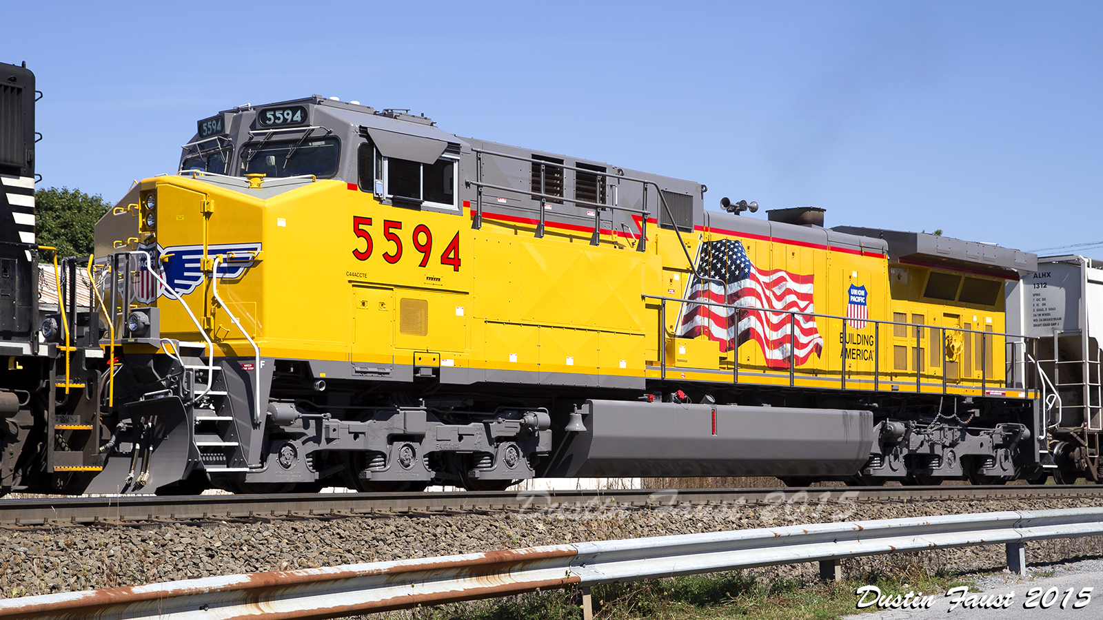 Paint Date: September 2015 Photo Date: September 2015 UP 5594 had some pretty bad wreck damage. The body repairs were done by Curry Rail Servies. Mechanical and electrical repairs were done at the Juniata Shops as well as repainting. Photo by Dustin Faust |