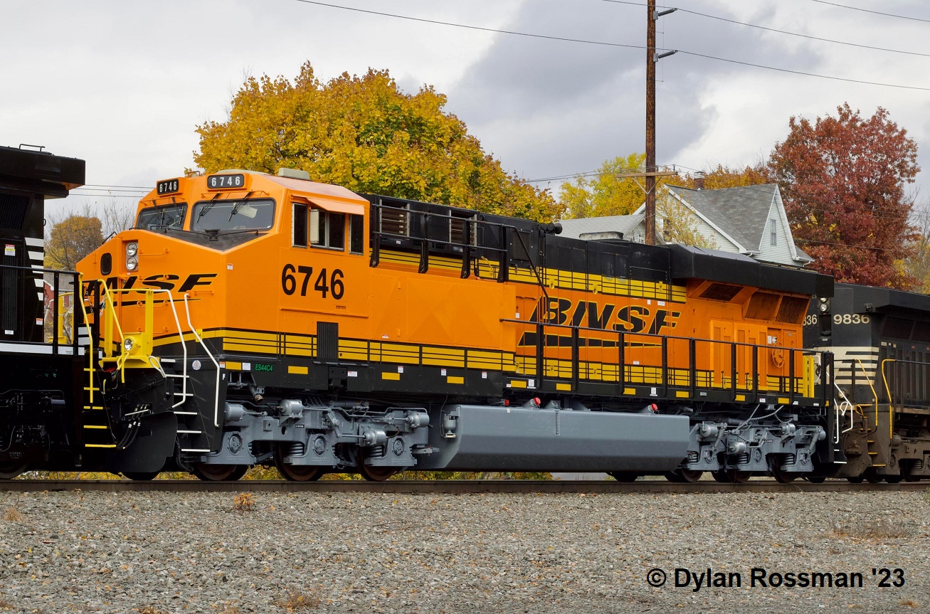 Paint Date: October 2023 Photo Date: October 2023 BNSF 6746 ES44C4 received a partial repaint following extensive wreck repairs. The unit was involved in a derailment on NS near Rome, GA in September 2022. Photo by Dylan Rossman |