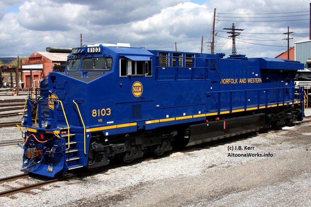 Paint Date: July 2018 Photo Date: July 2018 DC to AC rebuild NS 8520 AC44C6CF has been painted at Altoona after its rebuild at Roanoke. The 8520 is similar to the AC44C6M rebuilds but feature new CAF AC motors fitted to the original trucks, a TMV control system, a Ganser EUI system and reusing the original cab. Photo by Myers |