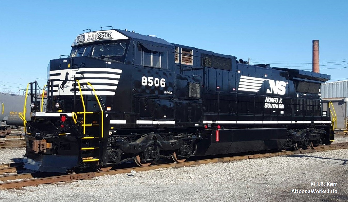 Paint Date: October 2015 Photo Date: November 2015 NS 8506 Dash 8.5-40CW rebuilt from a C40-8 at Roanoke and repainted at Altoona. Photo by J.B. Kerr |