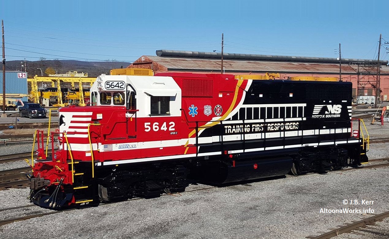 Paint Date: November 2015 Photo Date: November 2015 Rebuilt from a GP38 several years ago, NS 5642 emerged in a new "Training First Responders" scheme. Photo by J.B. Kerr |