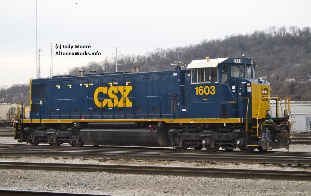 Paint Date: March 2011 Photo Date: 2011 CSXT 1603 is a new Railpower RP20CD built at Juniata on an SD40 frame. Photo by Jody Moore |