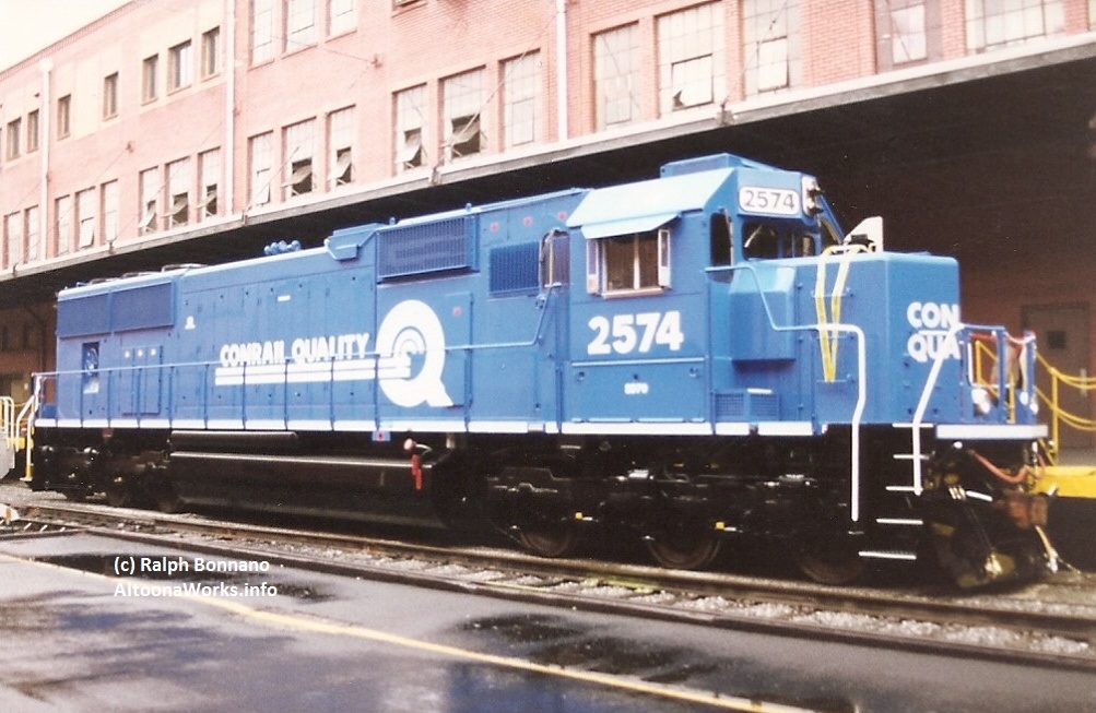 Paint Date: September 1998 Photo Date: September 1998 Built and freshly painted in Altoona, NS 2574 is on display next to the General Office Building. This group of SD70s were the last engines to get real Conrail blue. Photo by Ralph Bonnano |