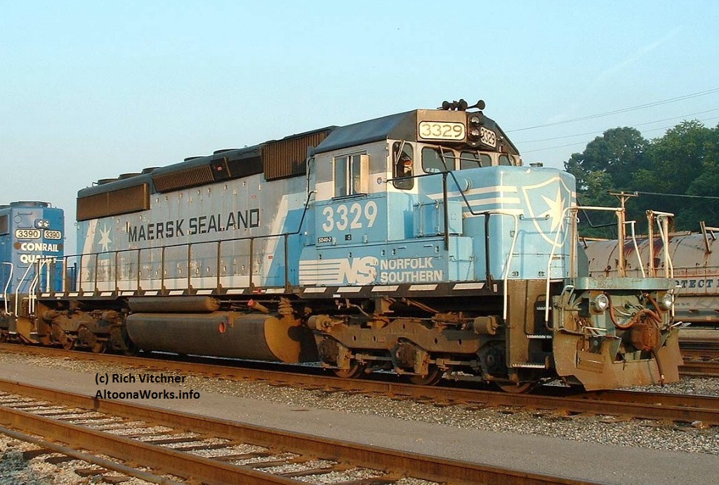 Paint Date: July 2002 Photo Date: July 2006 NS 3329 was Conrail's first SD40-2. It was painted Maersk as a promotion for a new intermodal facility in California. Photo by R.J. Vitchner |