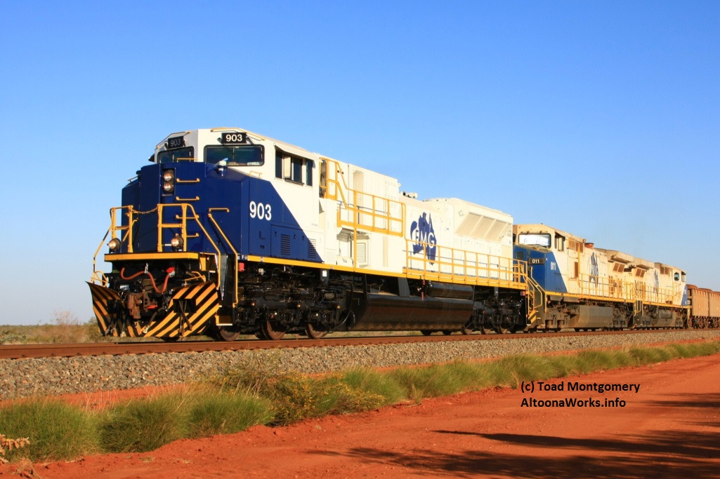 Paint Date: February 2011 Photo Date: June 2011 FMG 903 is one of four former Union Pacific SD90MAC-Hs overhauled and repainted in the US for Fortesque Metals Group in Australia. Juniata did two of these, 901 and 903. The remaining 5 units of FMG's order were repowered with 16-710G engines by the Juniata Shops. Photo by Toad Montgomery |