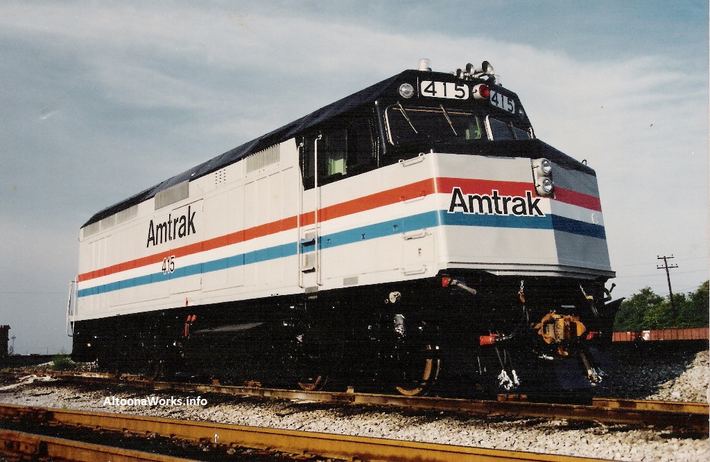 Paint Date: August 1990 Photo Date: August 1990 Amtrak 415 is one of the group of six former GO Transit F40PHs which Amtrak bought. Before entering service on Amtrak, they were sent to the Juniata Shops to get dynamic brake and cab a/c added as well as other Amtrak-specific tidbits. Conrail photo |